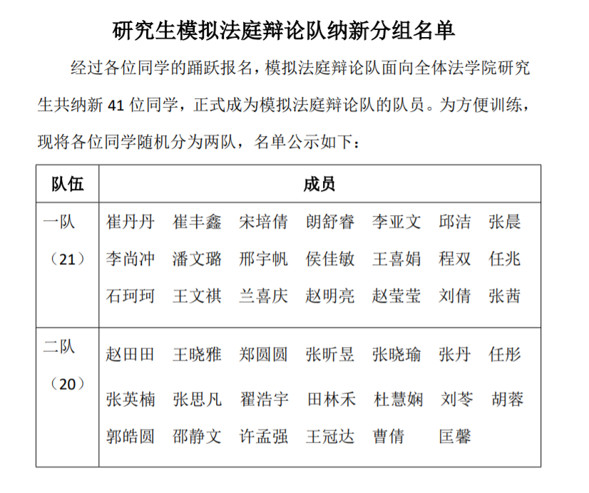 经过各位同学的踊跃报名,模拟法庭辩论队面向全体242net必赢研究生共纳新41位同学,正式成为模拟法庭辩论队的队员。为方便训练,现将各位同学随机分为两队,名单公示见附件。