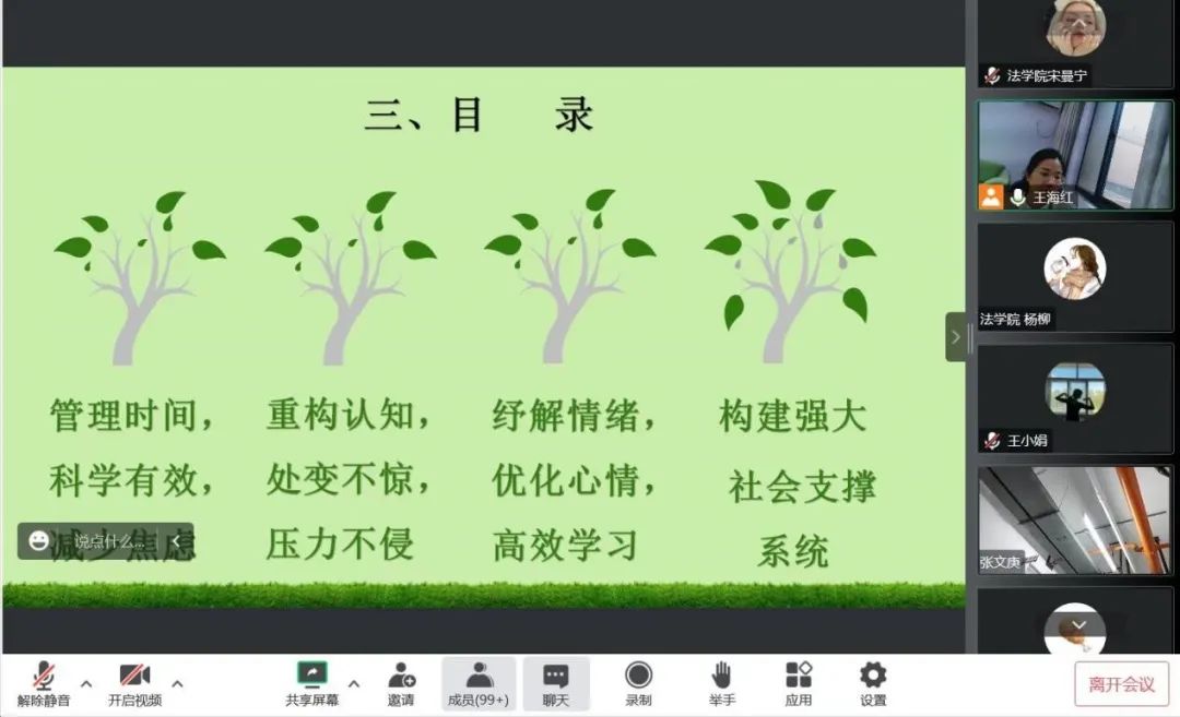 10月12日下午16时,在校心理健康教育中心的统一安排下,我院与数学学院合办,顺利开展研究生新生心理线上讲座。本次讲座主题为“生如夏花--研新心理压力与纾解”,由我校心理中心王海红老师主讲,数学学院与242net必赢260余名学生参加。