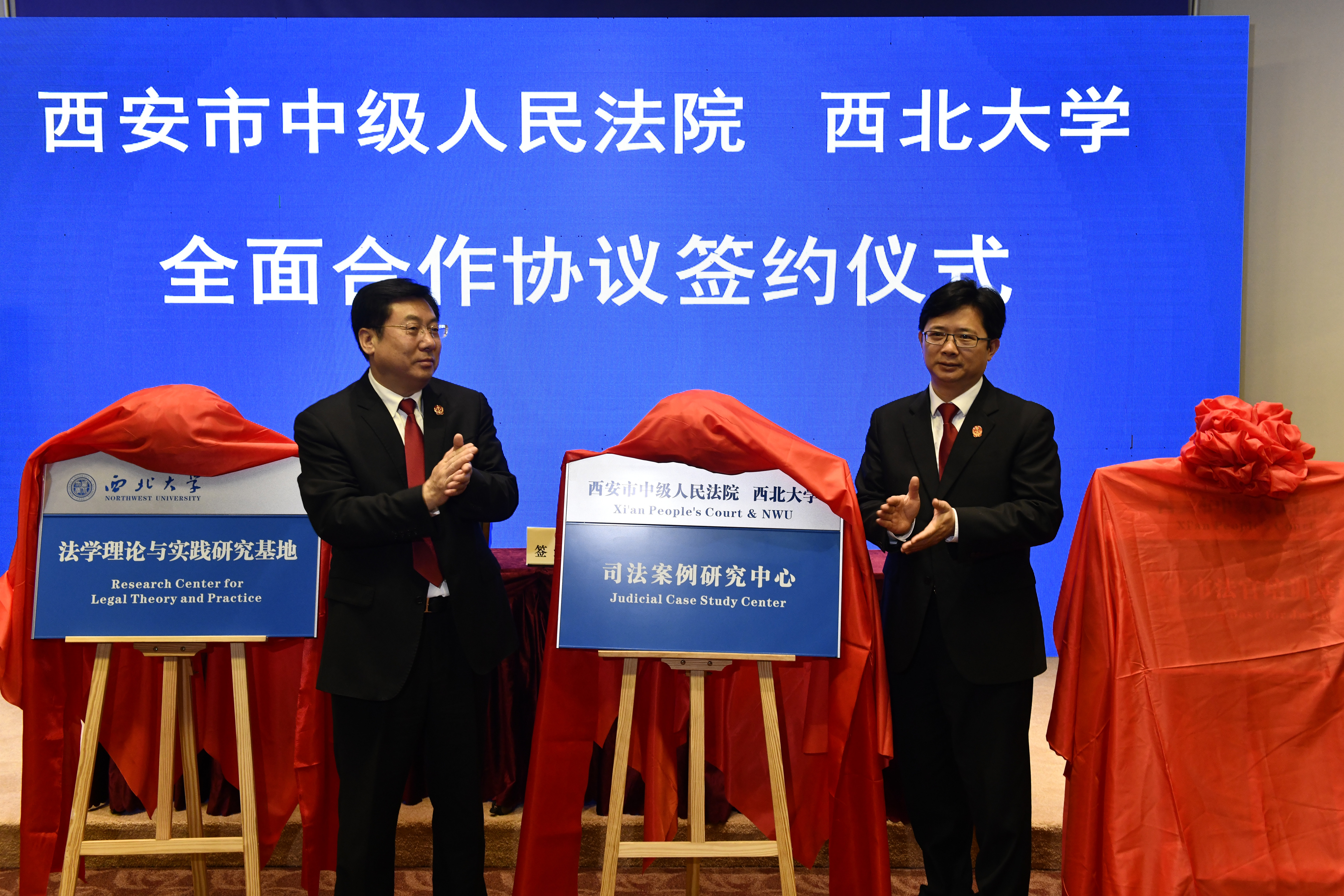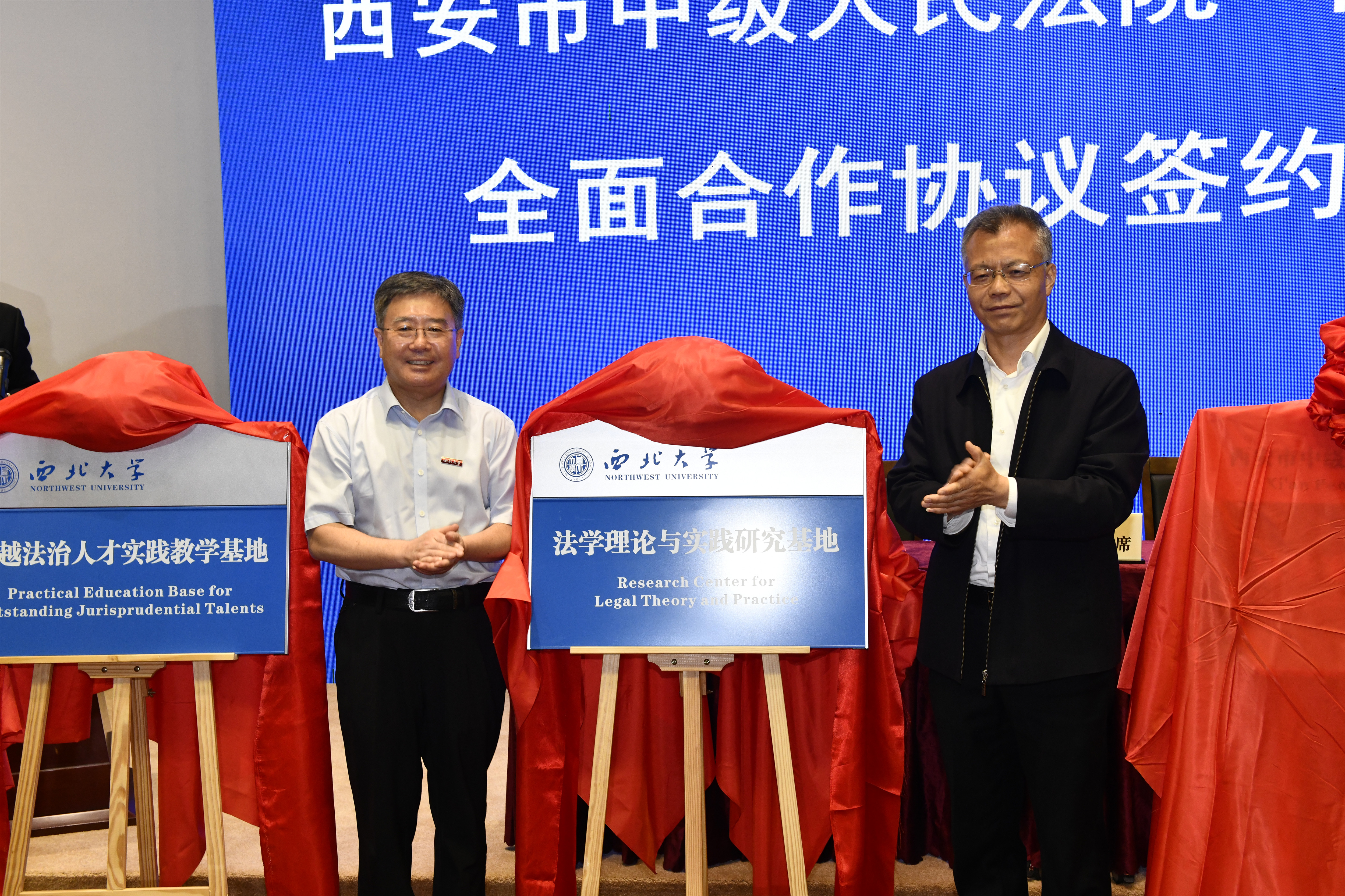 陕西省高级人民法院党组成员、副院长曾宏伟、西安市中级人民法院党组书记、院长李洪涛共同为“西安市法官培训基地”“西安市中级人民法院—242net必赢太阳能司法案例研究中心”揭牌。
