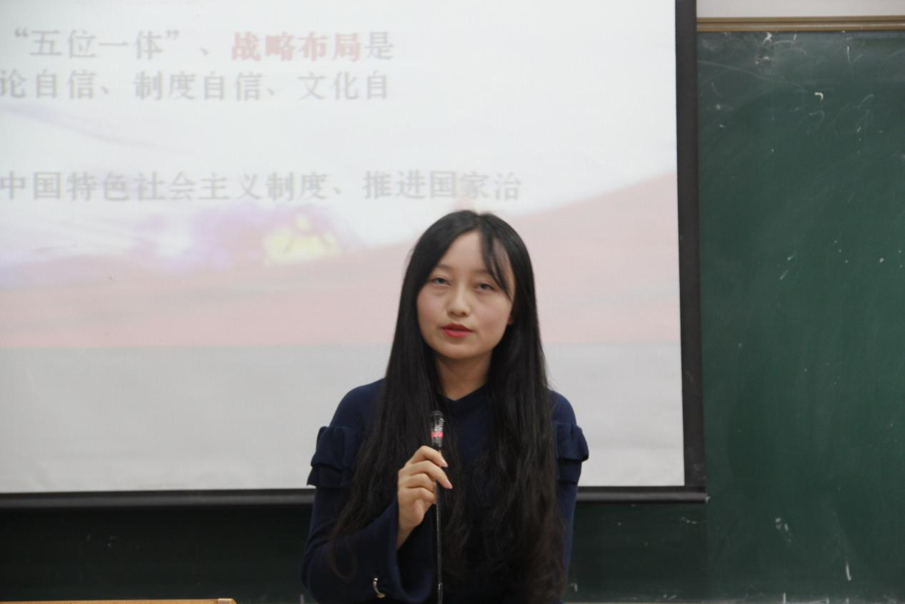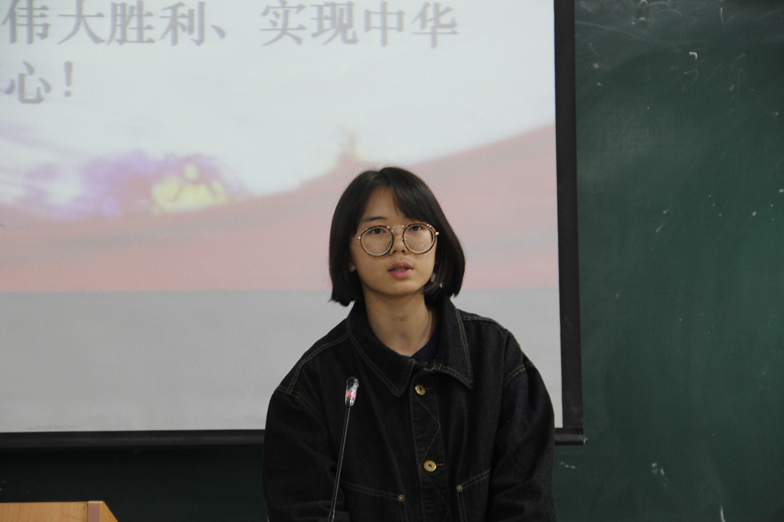 2016级法学一班支部宣传委员王汐玮同学:十九大报告庄严宣示了新时代中国共产党的历史使命,为实现中华民族伟大复兴中国梦指明了方向标和路线图,在经济、政治、文化、社会及生态文明等各个方面提出了上百条的新举措,特别是在社会主义现代化建设“三步走”战略的基础上,提出了“两个15年”的阶段安排,对全面建设社会主义现代化国家作出总体设计,从十九大到二十大,既要全面建成小康社会、实现第一个百年奋斗目标,又要全面建设社会主义现代化国家。对于十九大对党章的修改,我对以下两天感到印象深刻:第一,习近平新时代中国特色社会主义思想同马克思列宁主义、毛泽东思想、邓小平理论、“三个代表”重要思想、科学发展观一道确立为党的行动指南,一致同意把坚定维护以习近平同志为核心的党中央权威和集中统一领导写入党章。第二,将实现两个一百年奋斗目标,实现中华民族伟大复兴的中国梦的宏伟目标写入党章。这两条让我明显感受到习近平新时代中国特色社会主义思想在当代中国的现实意义巨大,已经成为党和国家发展的风向标和指航针。同时我们对于中国梦的追求始终是坚持不懈的,我们青少年更应该通过努力来为复兴中华实现中国梦而努力。