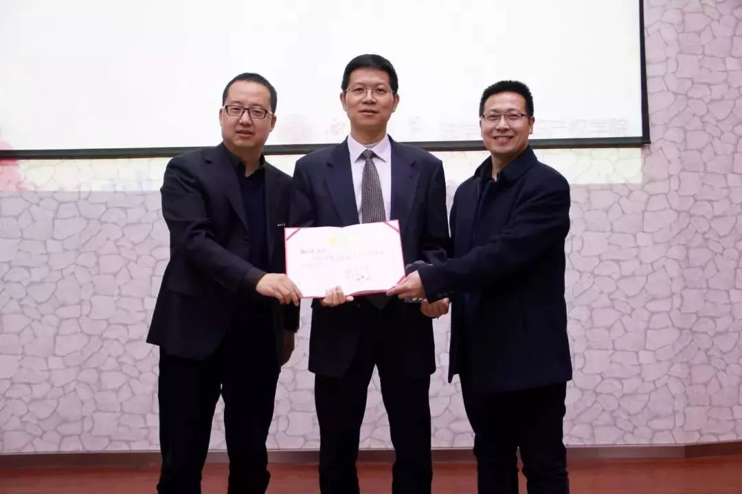 (教师工作部部长曹振纲、院长王思锋教授为施正文教授颁发聘书及纪念牌)