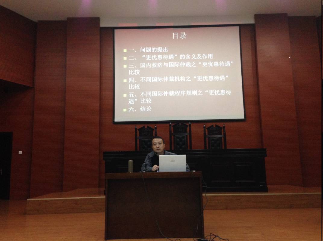 1025日,我院田海老师在长安校区模拟法庭为学院师生做“最惠国条款适用于投资争端解决的‘更优惠待遇’问题研究”的学术讲座,二百余名师生聆听讲座,张建军老师和涂慧老师担任点评嘉宾,此讲座是我院研究生学术月活动系列讲座(一)。