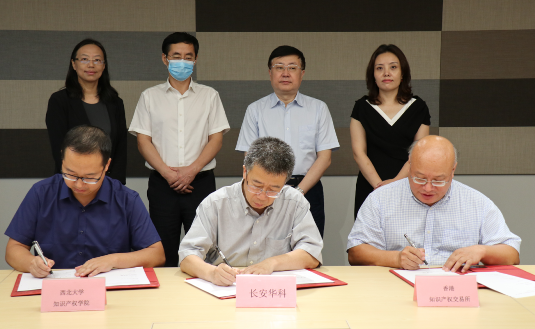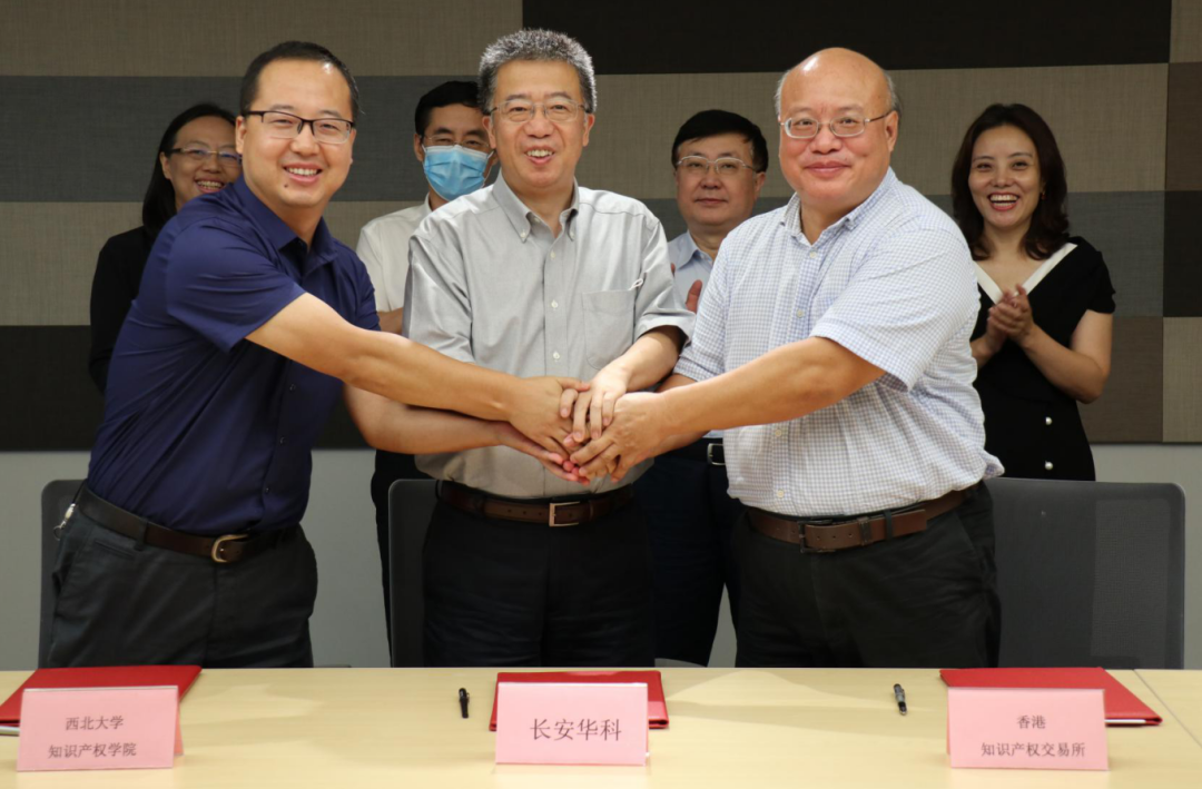 8月7日,我院与陕西长安华科发展股份有限公司、香港知识产权交易所三方战略合作签约仪式暨知识产权运营研讨会在普汇中金国际中心举行。陕西投资集团党委委员、董事、副总经理龙兴元、省知识产权局副局长李迎波、香港知识产权交易所主席吴高林、长安华科董事长袁京连、陕西创业学院院长徐娟、金杜律师事务所知识产权部合伙人瞿淼、我院院长王思锋、副院长邱洪华、成剑及省金融局等相关部门负责同志出席会议。会议由长安华科总经理赵凯辉主持。