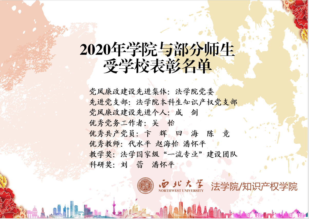 在庆祝大会上,学院党委荣获“党风廉政建设先进集体”,学院本科生知识产权党支部荣获学校“先进党支部”,成剑同志荣获学校“党风廉政建设先进个人”,卞辉、田海、陈竟三位同志荣获学校“优秀共产党员”称号,吴怡同志荣获学校“优秀党务工作者”,代水平、赵海怡、潘怀平三位同志荣获学校“优秀教师”、法学国家级“一流专业”建设团队荣获学校“教学奖”、刘蕾、潘怀平两位同志荣获学校“科研奖”。