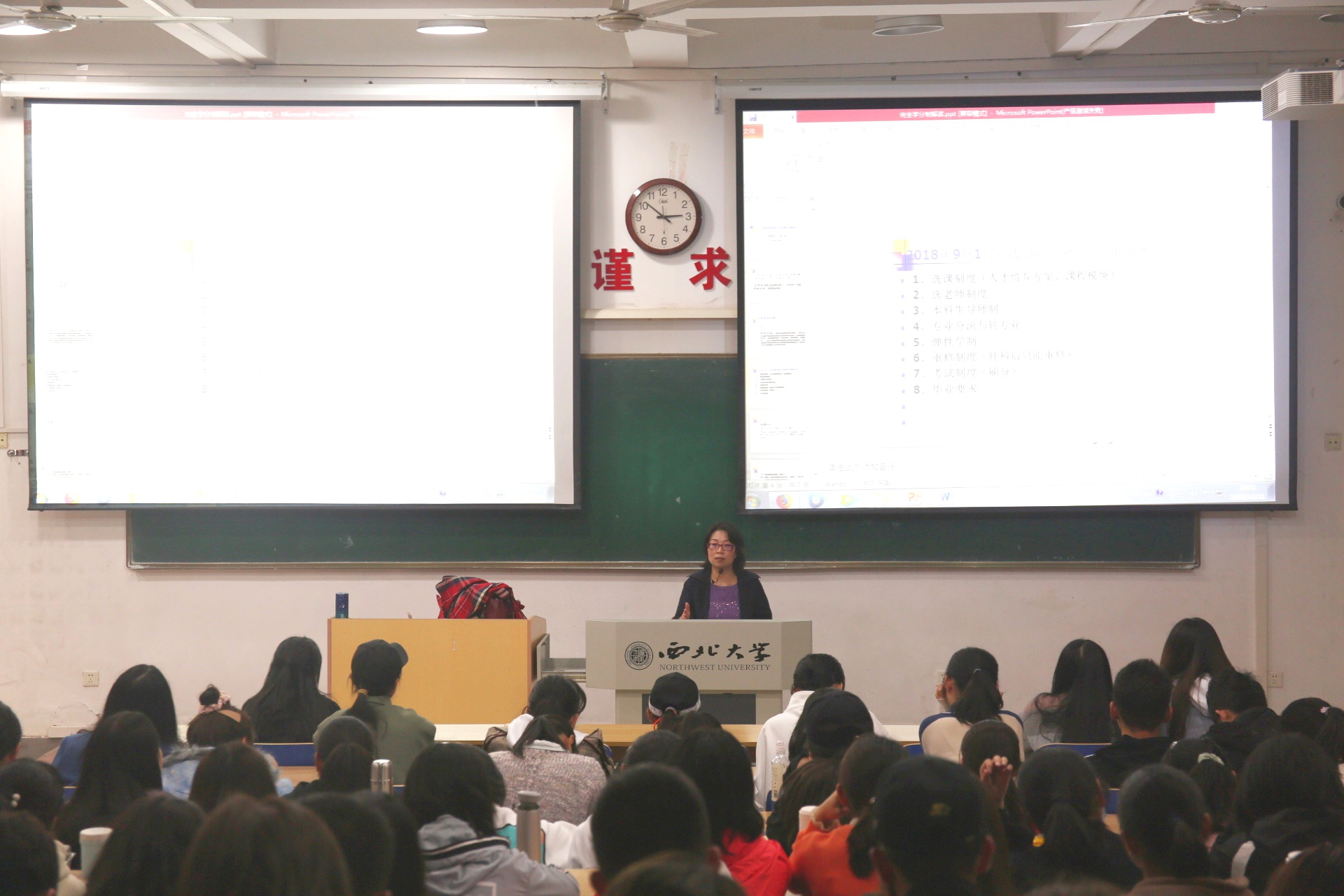 听完郑老师给同学们的讲解后,王凯霞老师为同学们详细具体地介绍了学生培养方案以及大学教学计划,丰富的课程内容让同学们感受到法学分类之精细。紧接着,王老师给同学们讲解了关于辅修的制度,辅修可以增加多方面的知识储备,提高同学们的专业水平。最后,王老师就“大学生创新创业”项目给同学们进行了介绍,让同学们对未来的学习有了更大的期待。