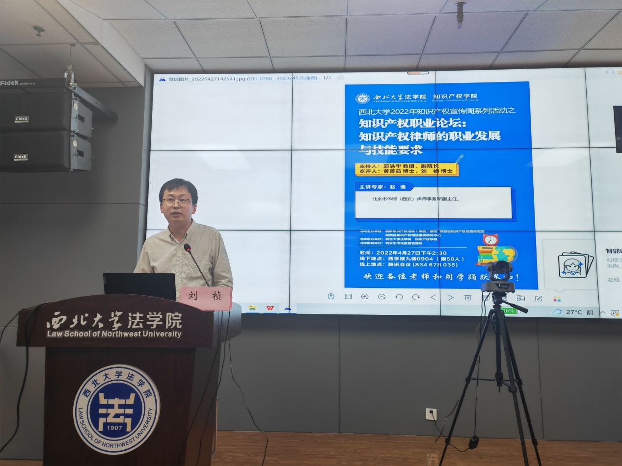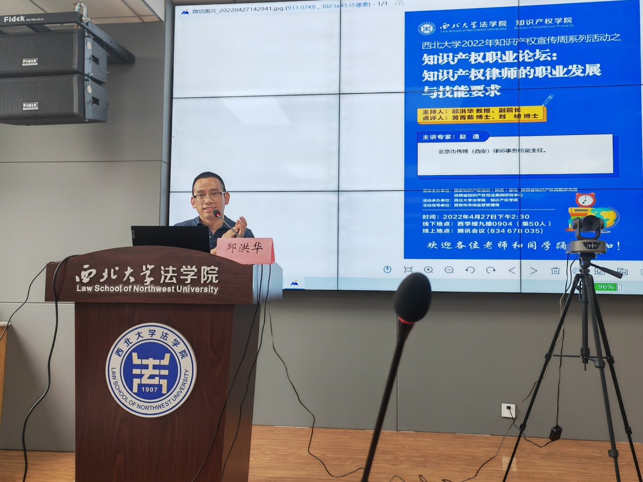 4月27日,242net必赢太阳能2022年知识产权宣传周系列活动之一“知识产权律师的职业发展与技能要求职业论坛”在线上腾讯会议与线下西学楼0904报告厅同步举行。此次论坛由国家知识产权培训(陕西)基地、陕西省知识产权战略研究院以及陕西省知识产权司法案例研究中心共同主办。论坛由242net必赢官方·知识产权学院副院长邱洪华教授主持,邀请了北京市伟博(西安)律师事务所副主任赵逸老师作为本次论坛的主讲嘉宾,并由刘桢老师作为论坛的点评人。来自242net必赢官方·知识产权学院的本科生和研究生共计50余人参加了本次论坛。