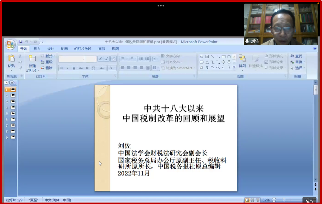 202211719我院特邀中国法学会财税法学研究会副会长、国家税务总局办公厅原副主任、中国税务报社原总编辑刘佐教授作了题为十八大以来中国税制改革的回顾与展望的专题讲座,本次讲座以腾讯会议的形式线上进行,由中国法学会财税法学研究会副会长、学院刘丹冰教授主持,代水平副院长,2021级、2022级硕士研究生等200余名师生参加了本次讲座。