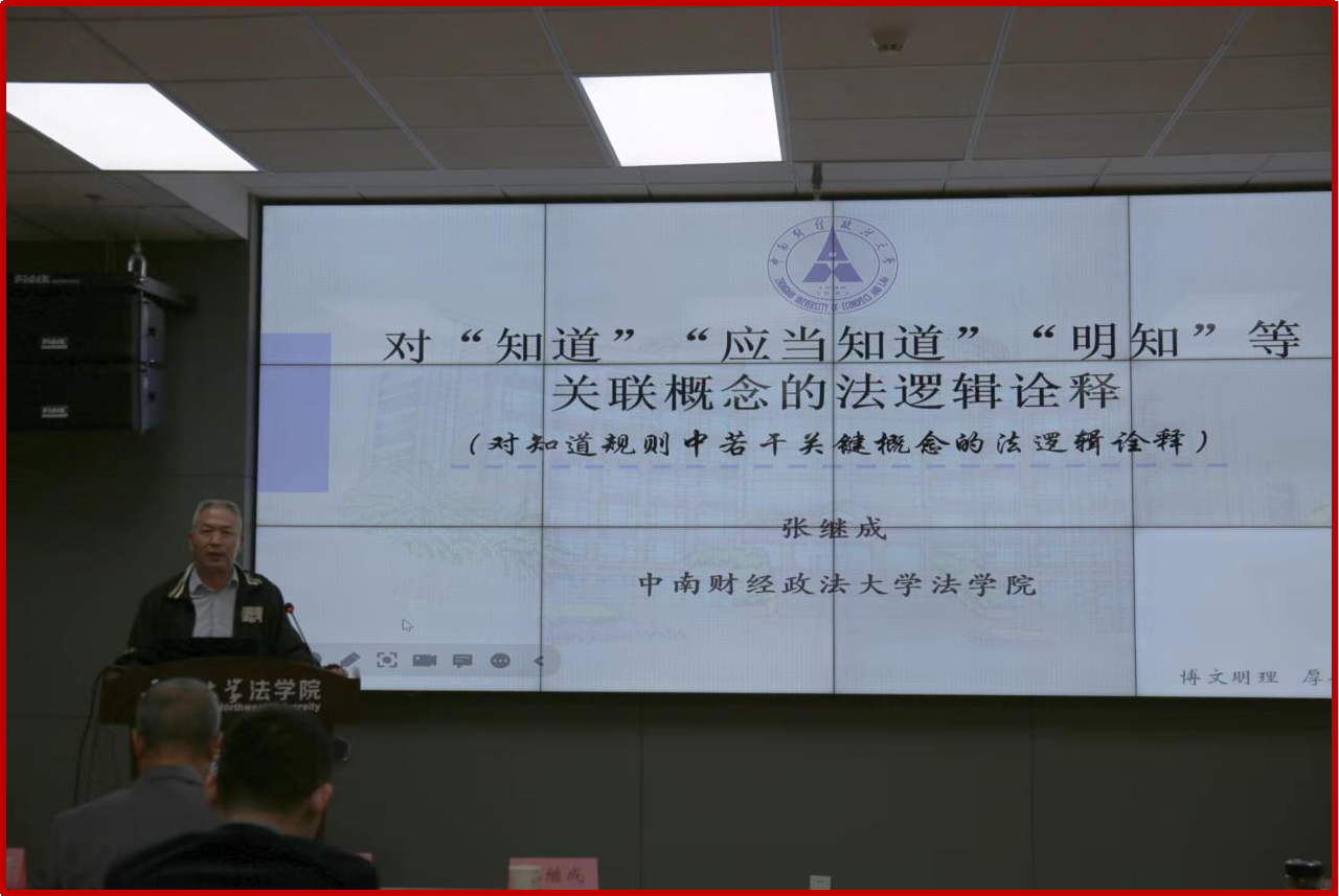 2023年10月13日,中南财经政法大学二级教授、中国法律逻辑学会会长张继成教授受邀做客我院“法学前沿论坛”,为我院师生带来了题为“法律上的‘知道’‘应当知道’‘明知’是什么意思?”的报告。西安交通大学242net必赢刘东亮教授、北京(西安)康达律师事务所尚建飞律师,学院王鸿貌教授、武建敏教授,青年教师焦琰博士以及学生代表聆听了讲座。讲座由学院代水平副院长主持。