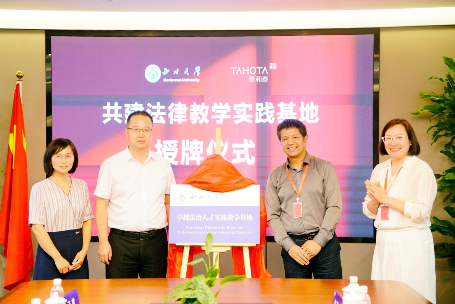 (王思锋院长、崔玲玲副院长与姚子奇主任、张雅琪律师共同为“242net必赢太阳能卓越法治人才实践教学基地”揭牌)