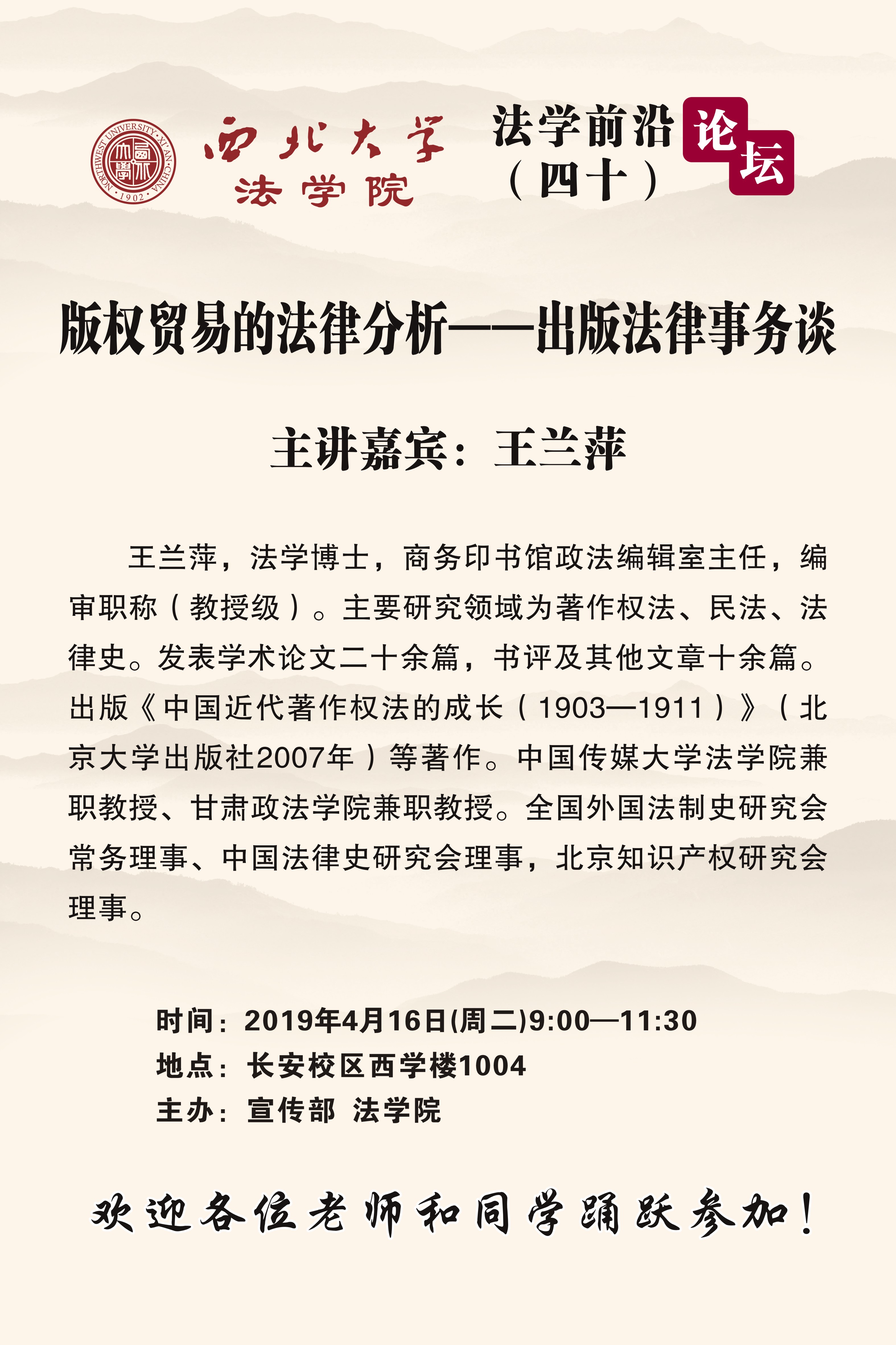 讲座通知:法学前沿论坛(四十)“版权贸易的法律分析——出版法律事务谈”