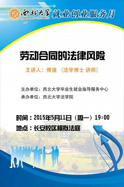 为引导毕业生树立法律意识,避免签订劳务合同时遭受法律风险,我院将于5月11日19:00在长安校区模拟法庭举办主题为《劳动合同的法律风险》的讲座,欢迎广大同学前来参加!