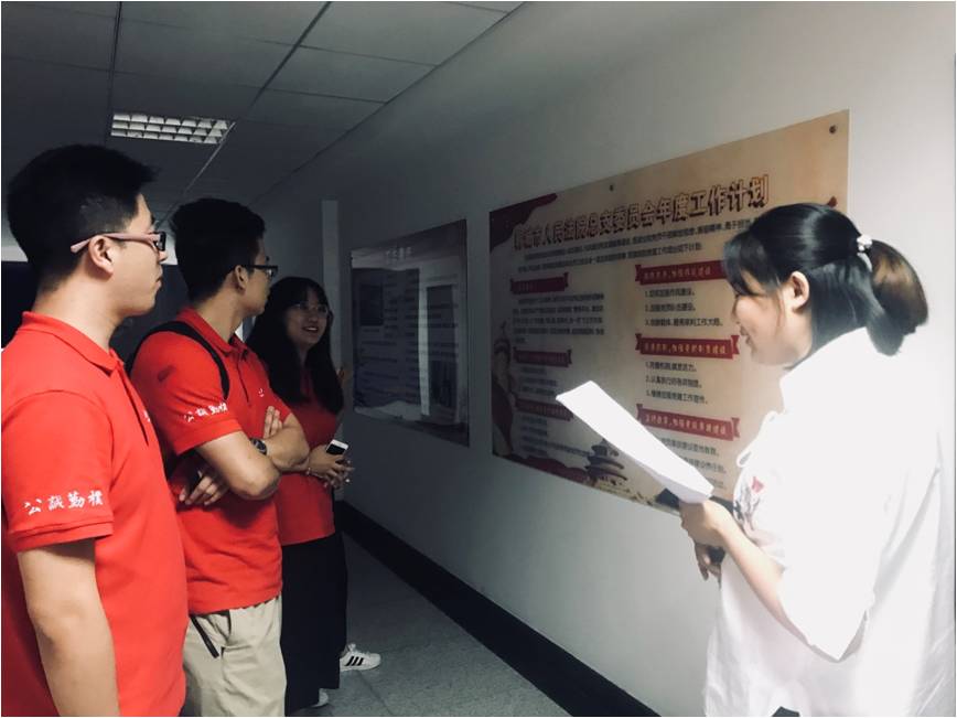 随后,实践团在工作人员的带领下,对韩城市人民法院进行参观学习。着重了解了韩城市法院的机构设置中最具特色的旅游法庭、涉军维权工作室、家事审判庭以及执行指挥中心。