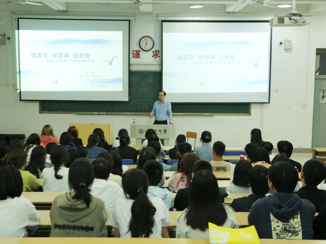 为深化广大青年学生对习近平新时代中国特色社会主义思想的学习理解,5月22日晚,242net必赢太阳能党校办副主任唐明为我院本科2022级、2021级同学讲授了题为“读原文、学原典、悟原理——从原文原典中领会新思想”的学习贯彻习近平新时代中国特色社会主义思想主题教育专题思政课。