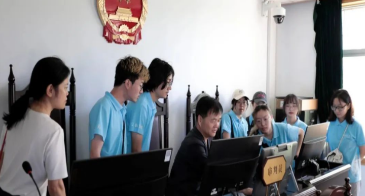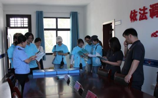在蓝关法庭,调研队参观了科技审判庭,在了解了信息化法庭设备的使用方法后,感慨于法院审判体系现代化程度。随后,队员们与法院工作人员开展座谈交流,通过学习乡约历史文化、观看中央电视台《乡约记》、诵读《蓝田新乡约》、听取实践案例介绍等方式,了解乡约在农村基层社会治理中的作用以及在司法实践中的适用情况。蓝关法庭胡光炜庭长向调研队介绍了蓝关法庭与各乡镇司法所、派出所形成的“庭所共建”治理模式,这一模式在推动矛盾纠纷化解于基层、减小法院办案压力等方面发挥的作用举足轻重。