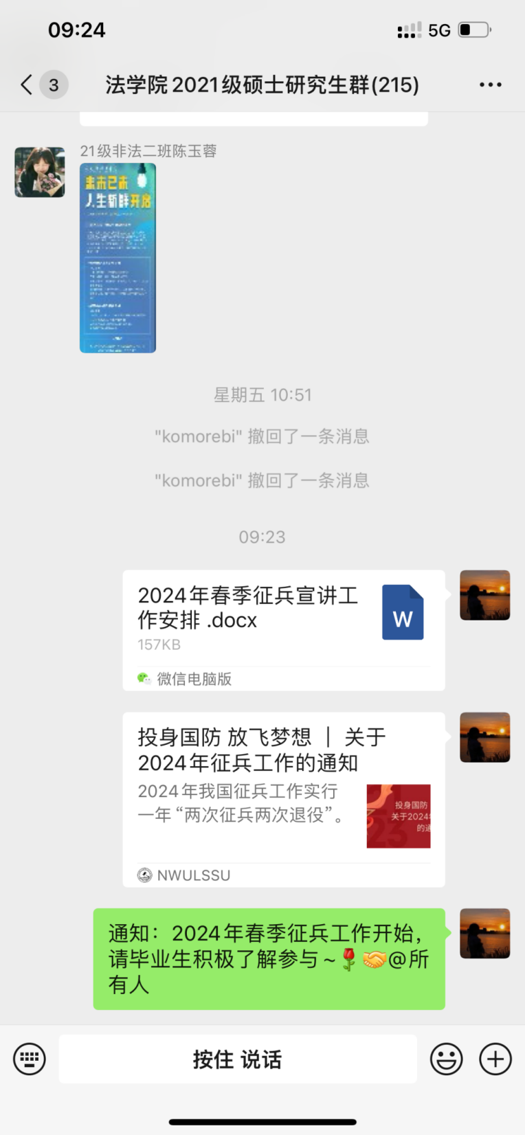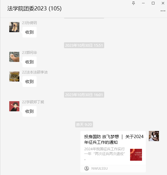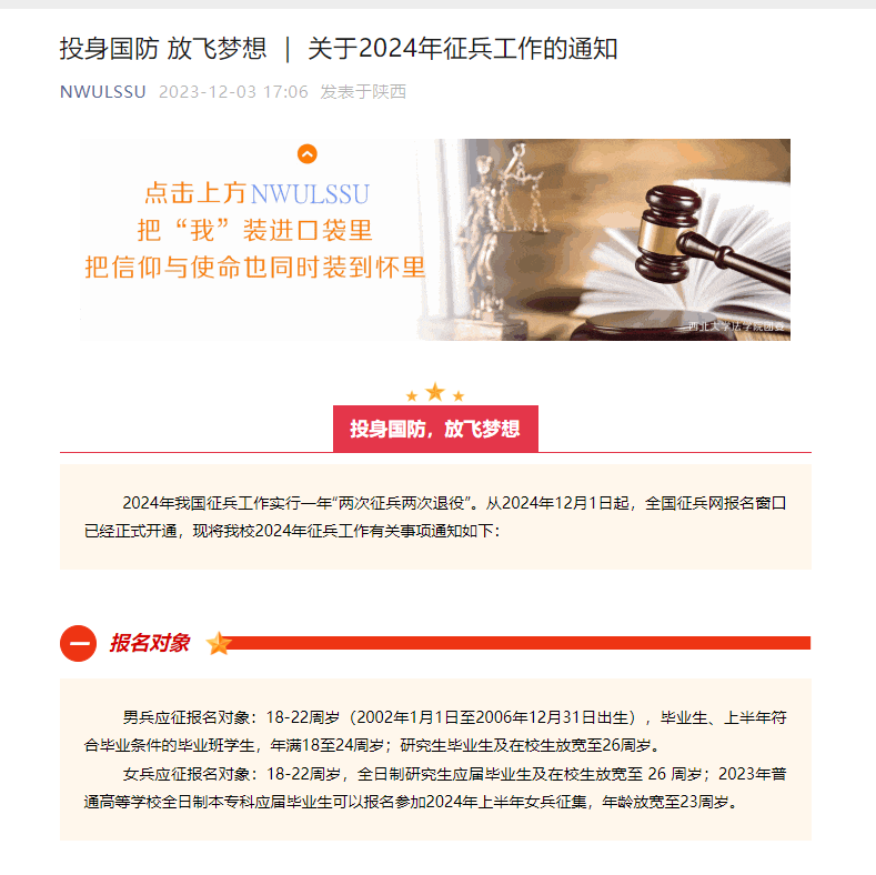 同时我院借助微信公众号、微信群、QQ群等各种线上渠道,积极发布征兵相关信息,使得每位同学都能够了解知晓征兵报名时间、报名流程、各校院征兵工作站联系方式,号召全体同学作为新时代青年就要积极行动起来,接过献身国防的接力棒,让红色基因薪火相传,将所学所知带到火热军营中去,将个人理想追求融入党和国家事业之中,到祖国最需要的地方去建功立业!
