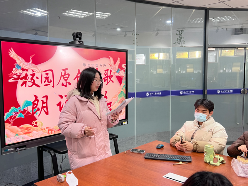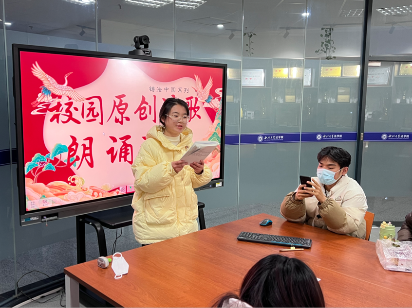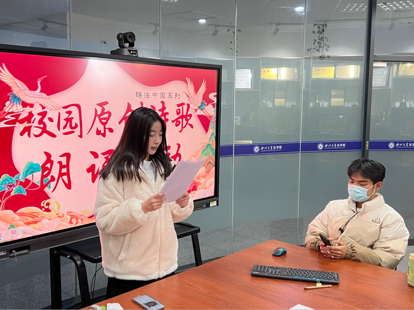 各位同学围绕党史、团史、榜样人物、党领导青年运动的光辉历程、习近平总书记对青年的谆谆教诲、民族团结等主题发散思维,大力弘扬中华优秀传统文化,原创诗歌并激情朗诵,进行多角度多层次阐释了中国特色社会主义法治理论。