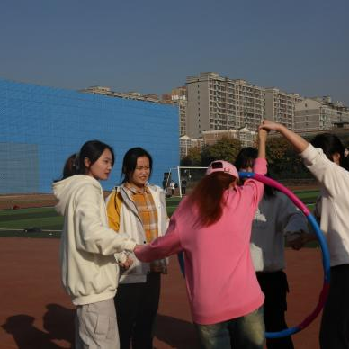每组所有成员手牵手围成圆圈,将呼啦圈套在起点学员的手臂,然后在不用手的情况下,将呼啦圈传递一圈回到起点,过程中只可以利用队友的身体传递呼啦圈。呼啦圈在运动员身上的游走,传递着团结与默契。