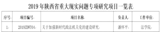 近日,陕西省哲学社会科学工作办公室公布了2019年陕西省重大现实问题专项研究项目(省级重大项目)立项名单我院潘怀平教授申报的《关于加强新时代政法机关党的建设研究》获得陕西省重大现实问题研究项目立项。