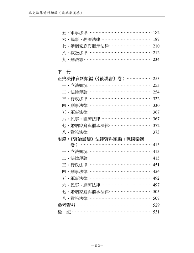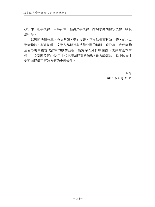 该资料集以《史记》《汉书》《后汉书》《资治通鉴》(先秦秦汉部分)为基础,摘录关于法律的相关史料,以编年的形式对于相关史料进行考证分析,同时在重点史料之下以“按语”的方式记录自己对于史料的认识。该书的编纂出版,为中国法律史研究提供了更为方便的史料条件。