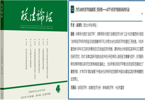 近日,我院赵海怡副教授独立撰写的论文《当代法和经济学发展的第三条进路——法学与经济学的双向校验互动》在法学类核心期刊《政法论坛2022年第4期发表。《政法论坛在近年来的中国法学核心科研评价来源期刊(CLSCI)排名中位居前列,在法学界享有很高的声誉。