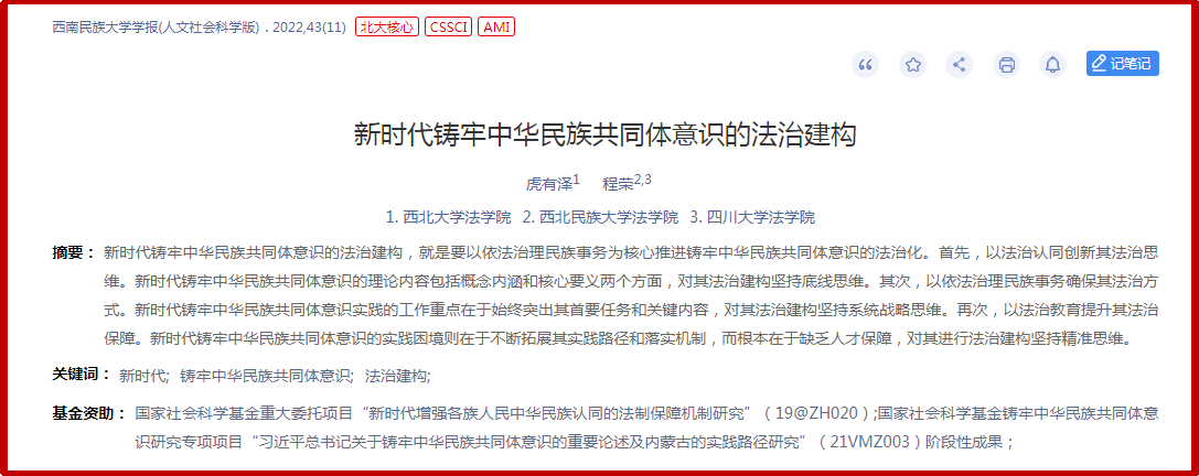 近期,我院虎有泽教授撰写发表了民族法学方向的系列论文。《新时代铸牢中华民族共同体意识的法治建构》在《西南民族大学学报》(人文社科版)2022年第11期发表,《铸牢中华民族共同体意识的法理阐释以地方组织法为例》《中南民族大学学报》(人文社科版)2022年第11期发表,《铸牢中华民族共同体意识的时代意义与实践路径》《民族学刊》2022年第12期发表,《提升依法治理民族事务水平》在《贵州民族研究》2022年第1期发表。该系列文是其主持的国家社科基金委托重大项目新时代增强各族人民中华民族认同的法制保障机制研究19@ZH020)的子课题的阶段性成果。