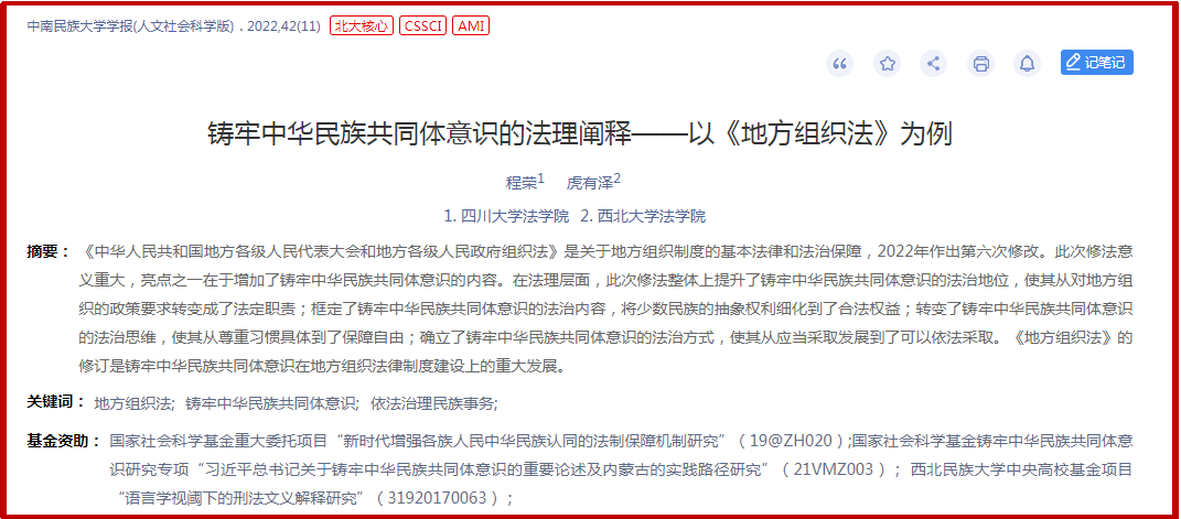 《铸牢中华民族共同体意识的法理阐释--以地方组织法为例》论文指出,2022年修改《中华人民共和国地方各级人民代表大会和地方各级人民政府组织法》,其一大亮点在于增加铸牢中华民族共同体意识的内容。在法理层面,提升了铸牢中华民族共同体意识的法治地位,使其从对地方组织的政策要求转变成了法定职责;框定了铸牢中华民族共同体意识的法治内容,将少数民族的抽象权利细化到了合法权益;转变了铸牢中华民族共同体意识的法治思维,使其从尊重习惯具体到了保障自由;确立了铸牢中华民族共同体意识的法治方式,使其从应当采取发展到了可以依法采取。《地方组织法》的修订是铸牢中华民族共同体意识在地方组织法律制度建设上的重大发展。