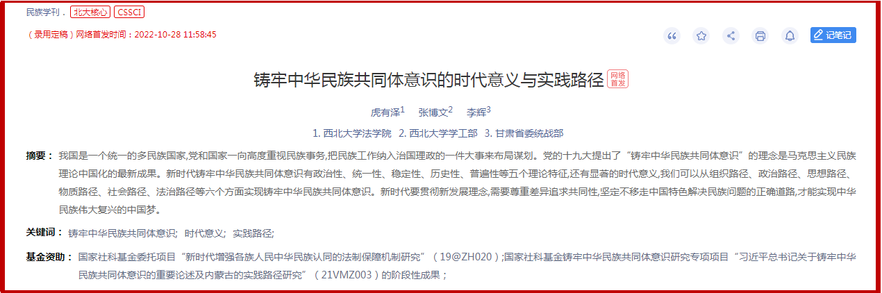 此外,二十大精神学习笔谈《坚持和完善民族区域自治制度》将于2023年第1《贵州民族研究》发表。受国家民委委托撰写的《构建铸牢中华民族共同体意识的法律法规体系》一文获得了国家民委领导人的批示