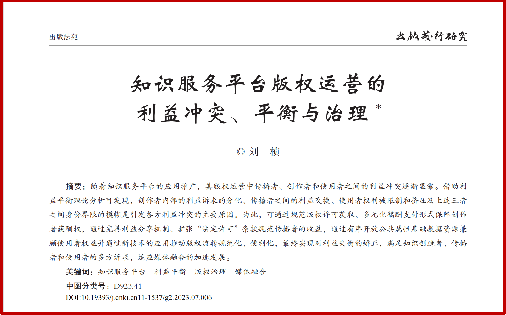 近日,学院青年教师刘桢在《出版发行研究2023年第7期发表题为知识服务平台版权运营的利益冲突、平衡与治理的论文该文认为随着知识服务平台的推广应用,其版权运营中传播者、创作者和使用者之间的利益冲突逐渐显露。借助利益平衡理论分析可发现,创作者内部的利益诉求的分化、传播者之间的利益交换、使用者权利被限制和挤压及上述三者之间身份界限的模糊是引发各方利益冲突的主要原因。为此,可通过规范版权许可获取、多元化稿酬支付形式保障创作者获酬权,通过完善利益分享机制、扩张法定许可条款规范传播者的收益,通过有序开放公共属性基础数据资源兼顾使用者权益并通过新技术的应用推动版权流转规范化、便利化,最终实现对知识服务平台版权运营利益失衡的矫正,满足知识创造者、传播者和使用者的多方诉求,适应媒体融合的加速发展。