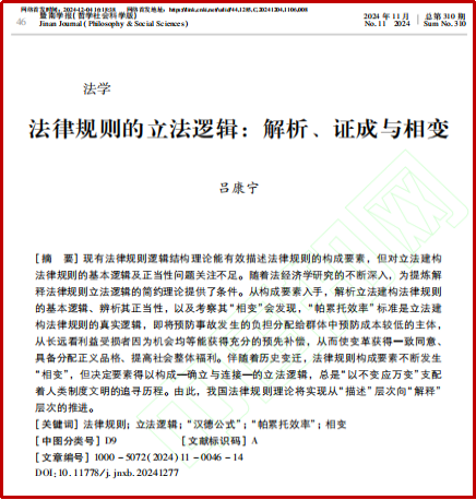 近日,学院教师吕康宁博士的论文法律规则的立法逻辑解析、证成与相变CSSCI来源期刊暨南学报(哲学社会科学版)2024年第11期发表。